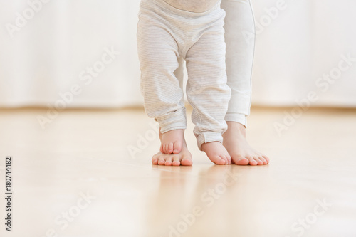 © Rithor, Fototapeta premium Cute baby boy learning to walk and make his first steps. mom is holding his hand. child's feet close up, copy space