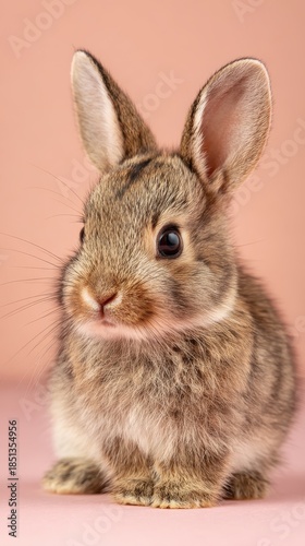 © PinkiePie, Obraz premium cute baby bunny stock hero image, simple pastel background, copy space