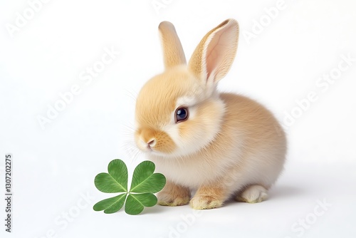 Obraz premium Cute baby bunny with a clover leaf on solid white background.