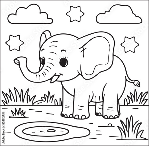 © Sabbir Rahman, Naklejka premium Cute Baby Elephant by Pond Coloring Page Ai Generated