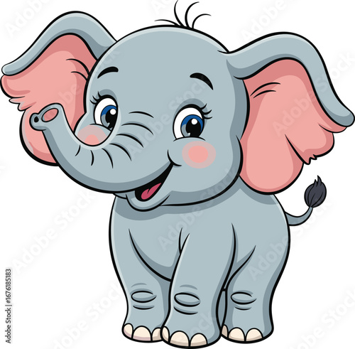 Fototapeta premium Cute baby elephant cartoon illustration, happy smiling animal, adorable wildlife character, children drawing, jungle safari animal art, zoo mascot design