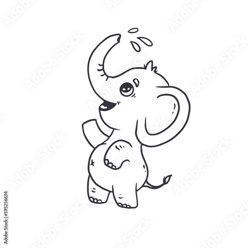 Obraz premium Cute baby elephant poured water from his trunk. Coloring book.Doodle style.