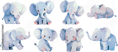 Fototapeta premium Cute baby elephant set. Watercolor vector baby shower decoration with adorable animal in various poses, sleeping, standing, sitting