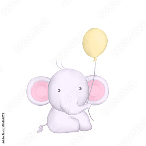 Naklejka premium cute baby elephant sitting and holding a yellow balloon