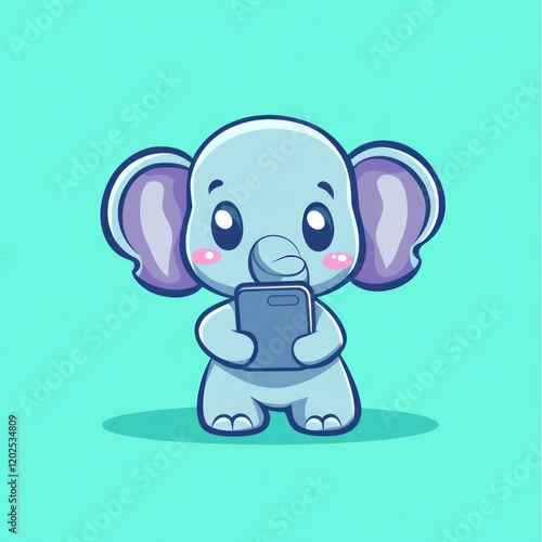© lestari, Fototapeta premium Cute baby elephant using phone; turquoise background; app icon