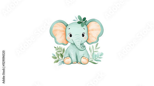 Naklejka premium Cute baby elephant with big ears and joyful expression surrounded by leaves