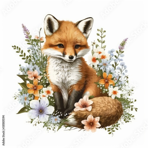 Obraz premium Cute Baby Fox Floral, Wildlife, Innocent, Playful, Charming, Spring Flowers, illustration ,clipart, isolated on white background