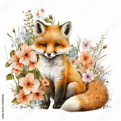 Obraz premium Cute Baby Fox Floral, Wildlife, Innocent, Playful, Charming, Spring Flowers, illustration ,clipart, isolated on white background