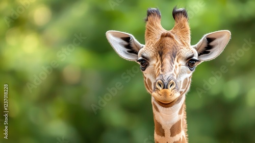 Naklejka premium Cute baby giraffe portrait, green bokeh background, wildlife, zoo