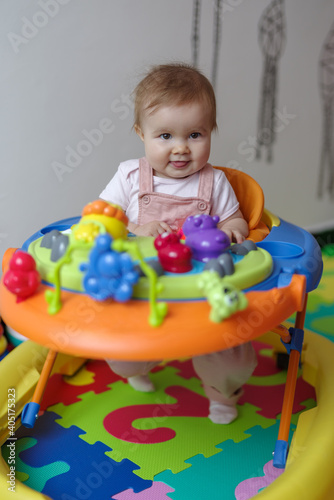 © Dmytro Surkov, Obraz premium Cute baby girl in baby walker at home