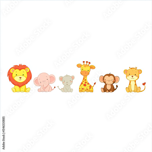 © Napaporn, Obraz premium Cute baby jungle animals sitting horizontal row with happy