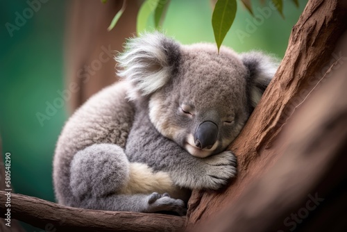 Naklejka premium Cute Baby Koala Bear sleeping in Eucalyptus Tree in Queensland, Australia. Adorable Sleepy Koala. Generative AI