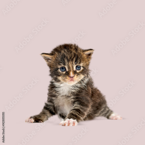 Obraz premium Cute baby maine coon cat crawling and playing on a pink studio background