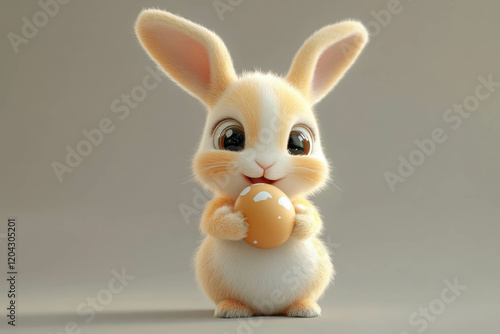 Fototapeta premium Cute baby rabbit holding an egg in its paws enjoys a playful moment indoors