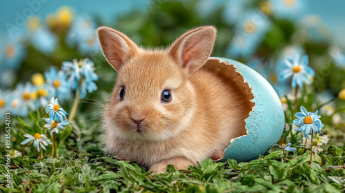 Fototapeta premium Cute baby rabbit inside broken easter egg in spring flowers