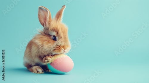 © Joyce, Fototapeta premium Cute baby rabbit with colorful Easter Eggs over blue background.