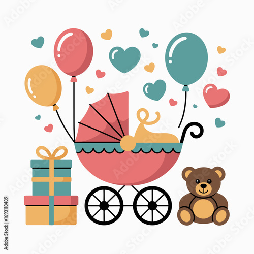 Fototapeta premium Cute baby shower decorations with stroller balloons and gifts