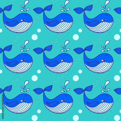 © anhut, Naklejka premium Cute background with cartoon blue whales. Baby shower design. Seamless pattern can be used for wallpapers, pattern fills, surface textures.