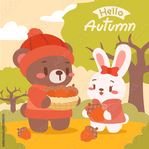 Fototapeta premium Cute Bear and Bunny Collecting Acorns in Autumn. Adorable Autumn Forest Scene with Bear and Bunny.