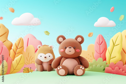 © Unclutter Aesthetics, Obraz premium Cute bear and hedgehog characters in colorful autumn landscape