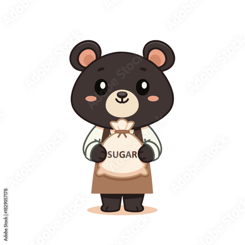 © Kanokpach Williams, Naklejka premium Cute bear barista holding a sugar bag – vector illustration