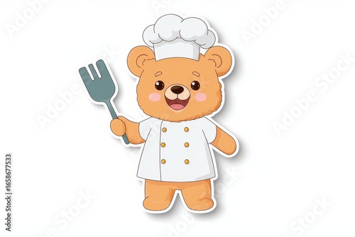 © Tee nuT, Obraz premium Cute bear chef character holding spatula, wearing chef hat and uniform, ready to cook with cheerful expression