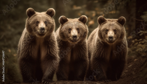 Obraz premium Cute bear cub standing in forest, looking at camera generated by AI