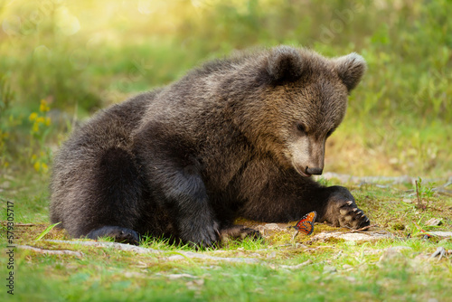 © giedriius, Fototapeta premium Cute bear cub watching at a butterfly