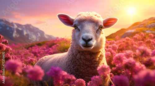 Fototapeta premium Cute, beautiful sheep in a field with flowers in nature, in sunny pink rays.