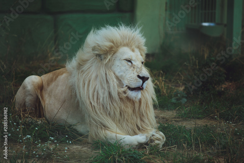 © Alexander, Naklejka premium Cute beautiful white lion lies on the nature in the grass.