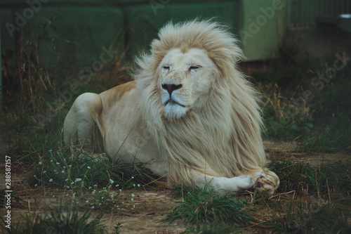 © Alexander, Naklejka premium Cute beautiful white lion lies on the nature in the grass.