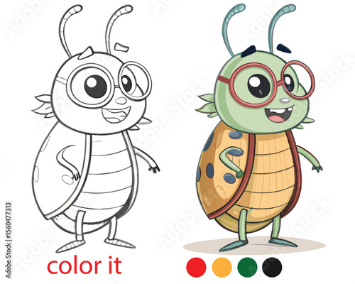 © Sonjoy, Naklejka premium Cute Beetle Coloring Book for Kids – Big-Eyed Cartoon Bugs with Smiles & Fun Expressions