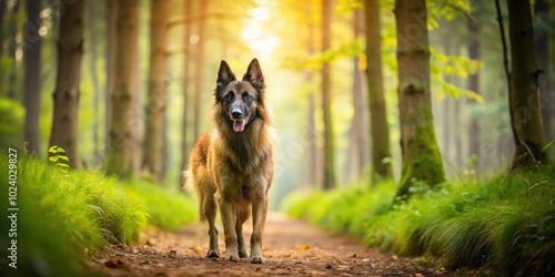 Fototapeta premium Cute Belgian Shepherd dog walking in a lush forest setting, Belgian Shepherd,...