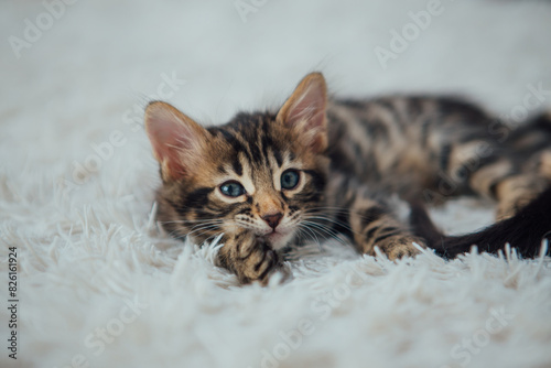 © Smile, Fototapeta premium Cute bengal one month old kitten on the white fury blanket close-up.