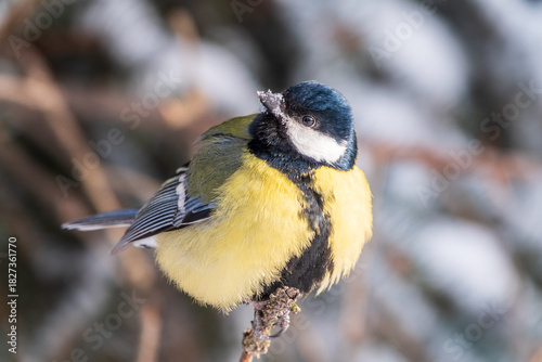 © Dmitrii Potashkin, Naklejka premium Cute bird Great tit, songbird sitting on a branch without leaves in the autumn or winter.
