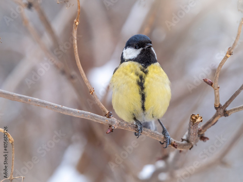 Naklejka premium Cute bird Great tit, songbird sitting on a branch without leaves in the...