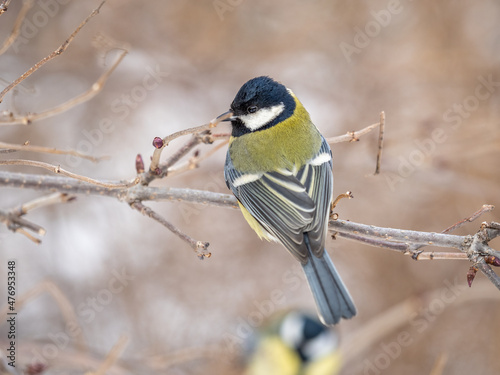 Naklejka premium Cute bird Great tit, songbird sitting on a branch without leaves in the...