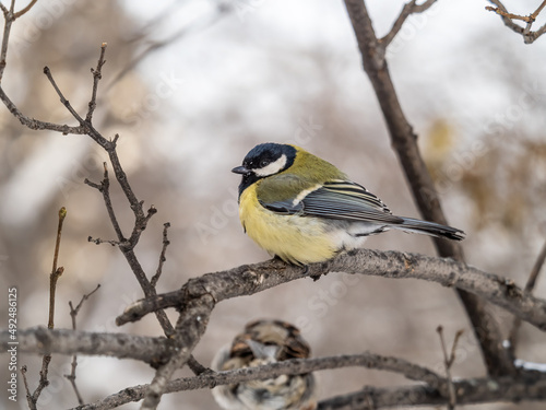 Naklejka premium Cute bird Great tit, songbird sitting on a branch without leaves in the...