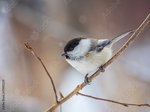Naklejka premium Cute bird the willow tit, song bird sitting on a branch without leaves in the winter.
