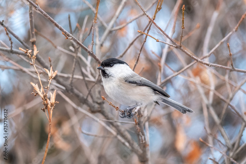 Obraz premium Cute bird the willow tit, song bird sitting on a branch without leaves in the...
