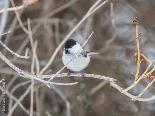 Naklejka premium Cute bird the willow tit, song bird sitting on a branch without leaves in the winter.