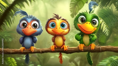 © 11faqihtanjung, Fototapeta premium Cute birds on a branch in a jungle