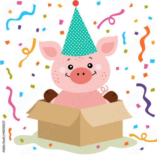 Naklejka premium Cute birthday pig in gift box