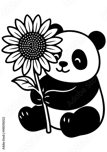 © Yana Sh, Naklejka premium Cute black and white vector of a panda holding a sunflower. Perfect for engraving, print, logo, book illustration, and creative projects