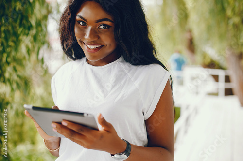 Fototapeta premium Cute black girl in a park. Lady in a white t-shirt and blue jeans. Woman with tablet