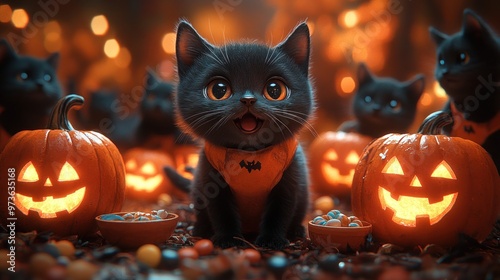 Naklejka premium Cute black kittens surrounded by Halloween pumpkins and treats.