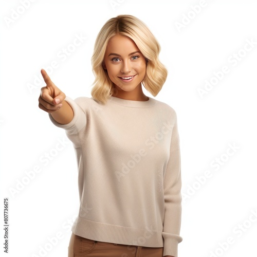 © tetxu, Fototapeta premium Cute blonde young woman pointing to, 3D render style, isolated on white background