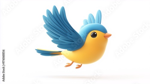 Naklejka premium Cute blue and yellow bird cartoon character flying, simple vector graphic on a white background
