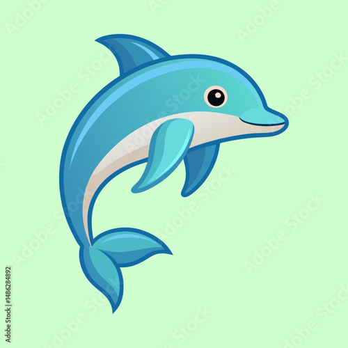 Obraz premium Cute blue cartoon dolphin jumping happily against a soft green background