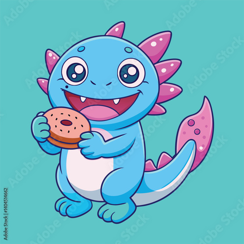 Fototapeta premium Cute Blue Cartoon Monster Holding A Donut On Teal Background